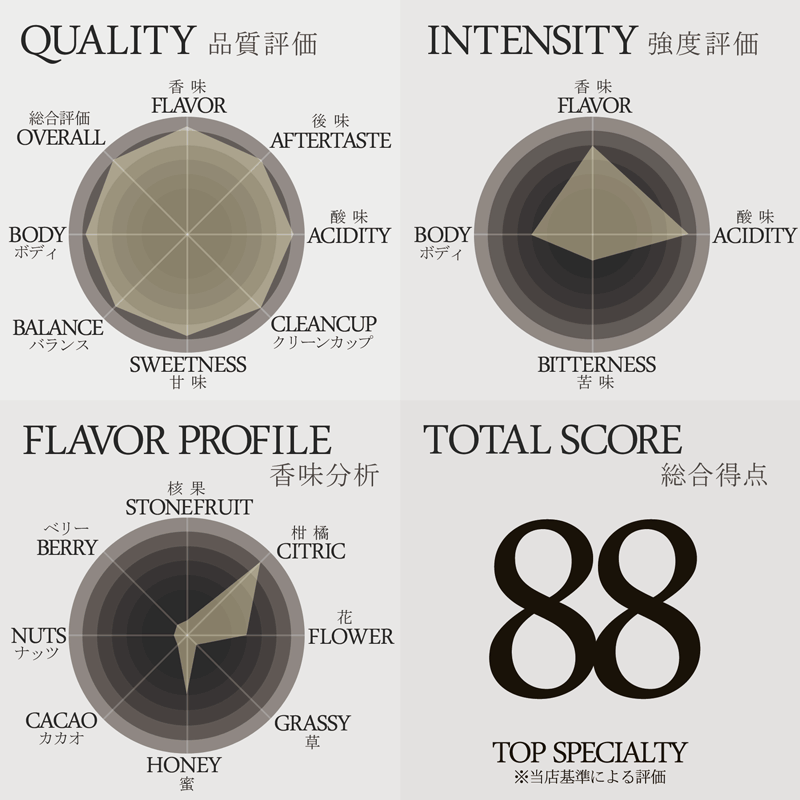 代名詞とも言える柑橘系果実やジャスミン、紅茶を連想させるフレーバーと透明感のある液質、すっきりとした甘い余韻など、SCAA基準で87-90点の安定したゲイシャのクオリティを感じる事の出来るロットとしてセレクトされたものを当店では使用しています。